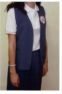 Falda (largo-debajo de la rodilla) y chaleco de tela azul con el emblema del Colegio.